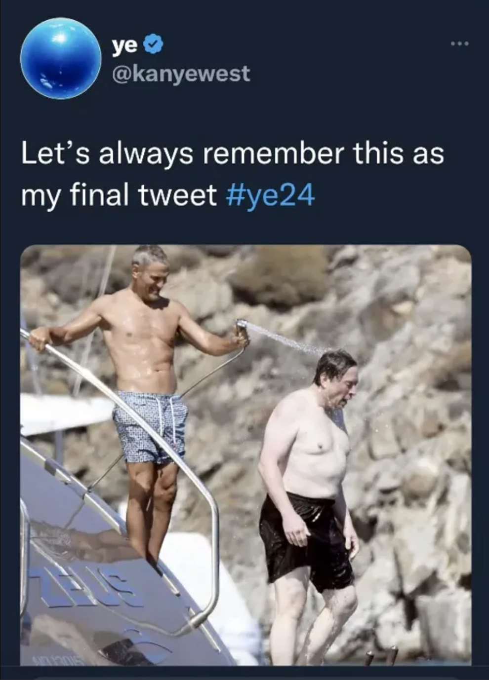 1 The tweet that got Kanye permabanned was when he showed a fat, weird-looking Elon vacationing on high-ranking, pro-censorship, globohomo ally Ari Emanuel’s mega-yacht and getting hosed off by him: