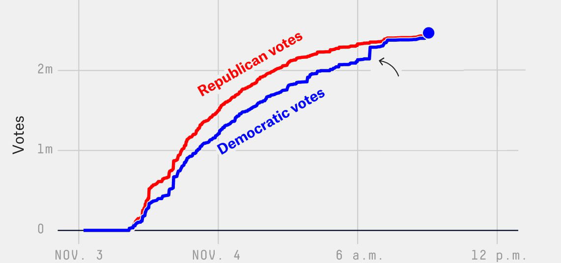 Just like for the 2016 election I and millions of other Americans stayed up all night watching the election results in real time, which provided a benefit to such observers as the record was quickly distorted in the “historical record.” Of course, this time the New York Times had learned its lesson and did not offer the wonderful live meter that it had offered in 2016 except to a limited extent for three swing states, where they had Trump winning by a wide degree before the vote count was stopped.