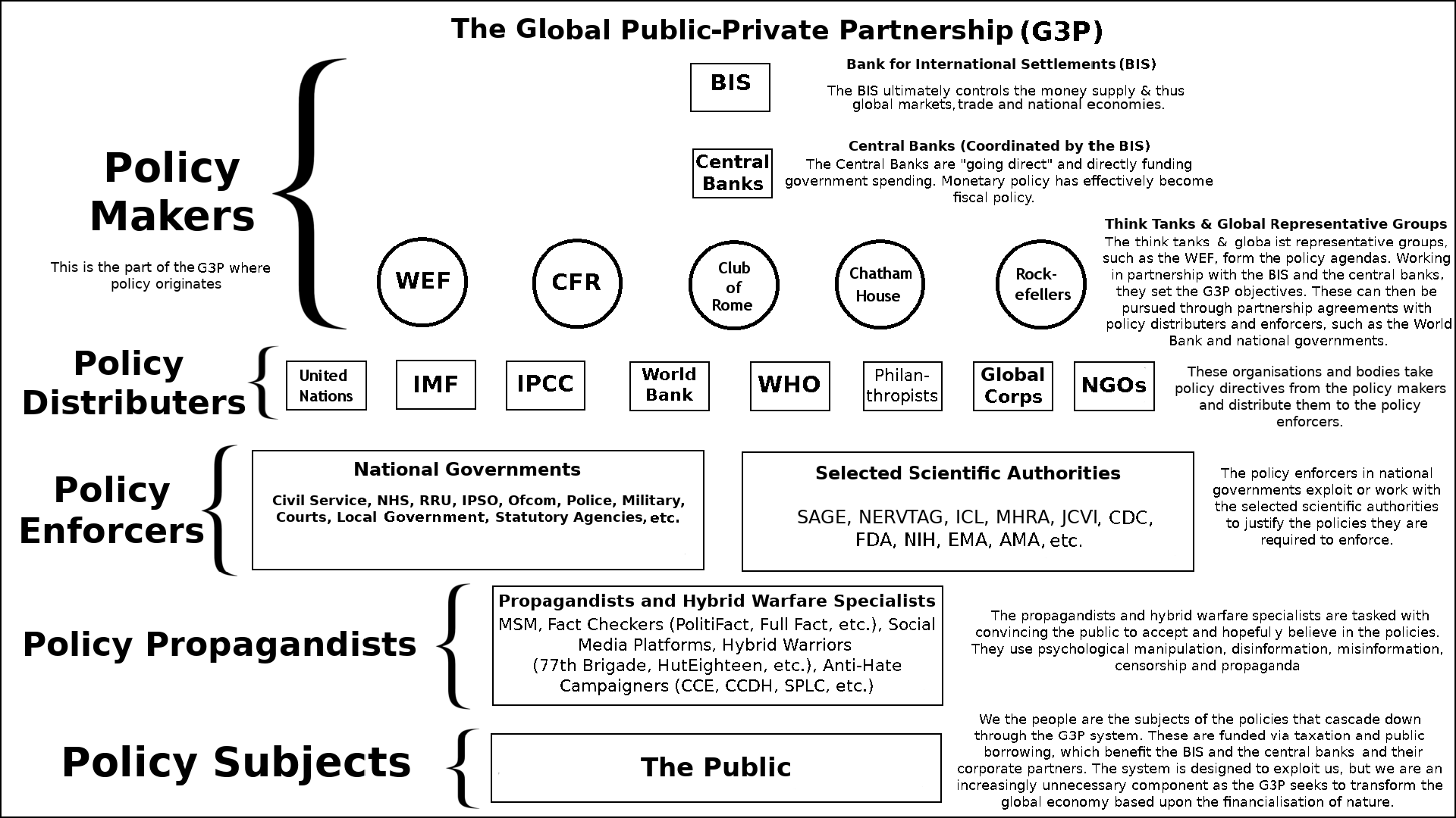 The argument made here describes the pyramid-structure organization chart for how the world is actually governed. Basically, the owners of the world central banks, coordinated by the Bank for International Settlements, is at the top of the power structure, followed by the policy makers (WEF, CFR, Club of Rome, etc.), then the policy distributors (UN, IMF, IPCC, World Bank, WHO, global corporations, NGOs), then the policy enforcers (including nation states and scientific authorities), then the policy propagandists (MSM, “fact checkers”, social media influencers, etc.) collectively serving as parasites and enemies of the general public over which it rules. As Iain Davis explains, “[Nation states] are subject to [the global governance system], just like the rest of us. The best they can achieve is “partner” status. And they are not senior partners.” If there wasn’t such a pyramid of control then the worldwide response to COVID would not have been uniform but highly varied and differentiated, but that is not what we saw with the events that transpired.